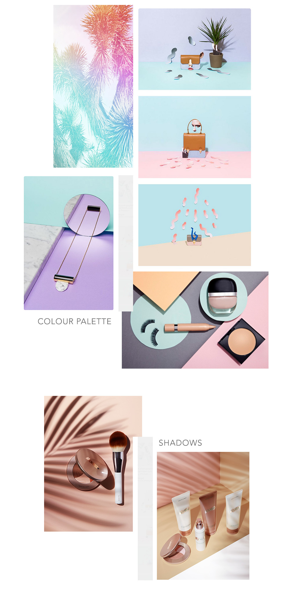 I created mood and concept boards tapping into current trends like Miami pastels mixed with nude tones and soft foliage shadows to give a summery, but sophisticated holiday feel, that complemented the themes of the beauty products themselves.